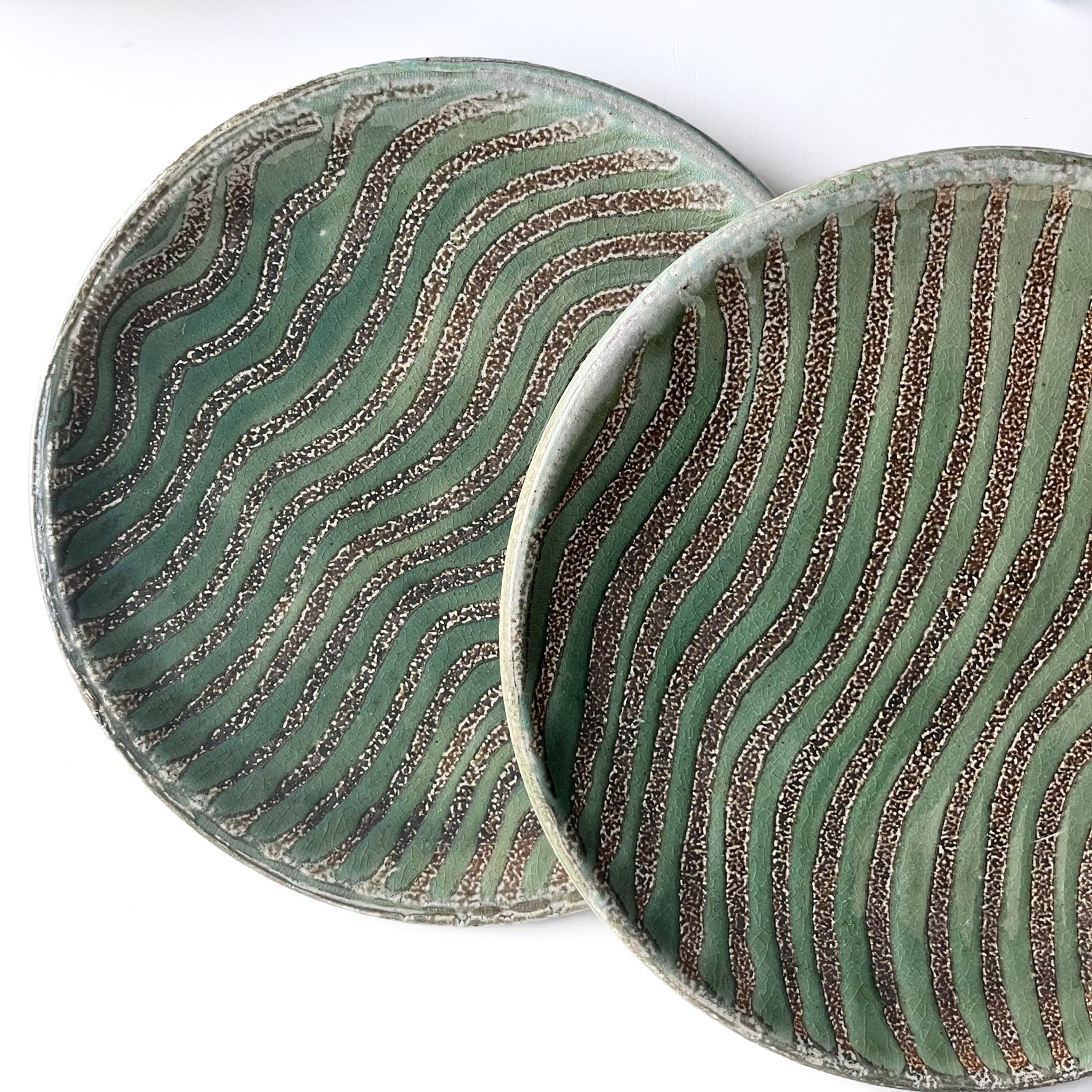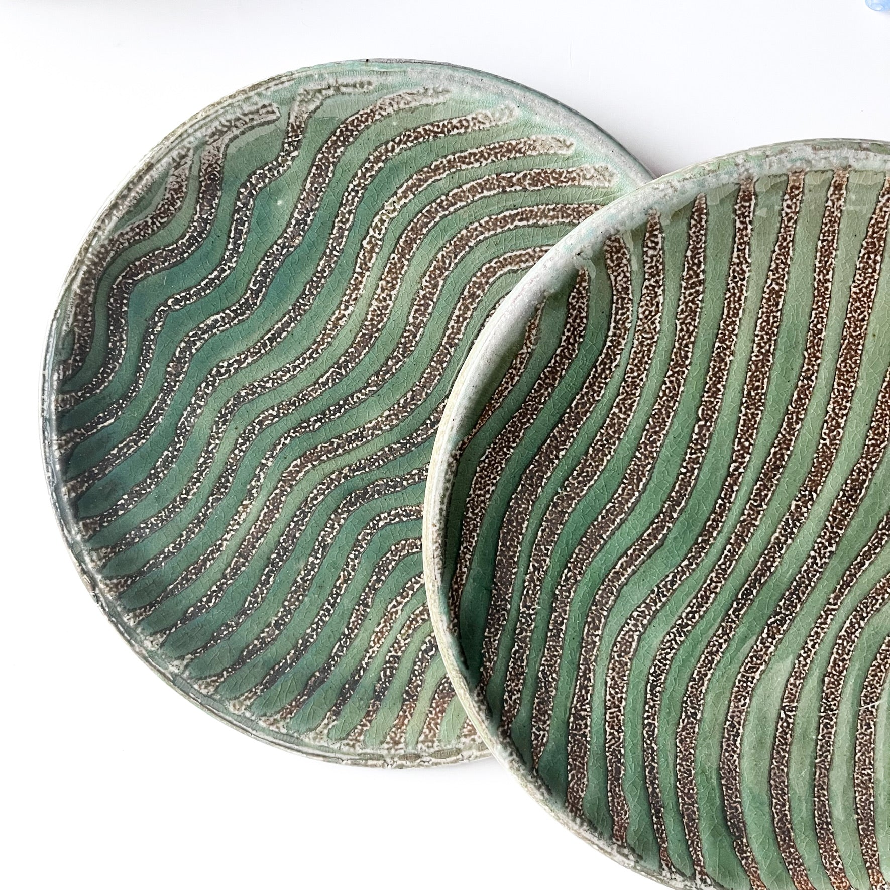 Wheel thrown stoneware clay, soda fired, green glazed patterned surface