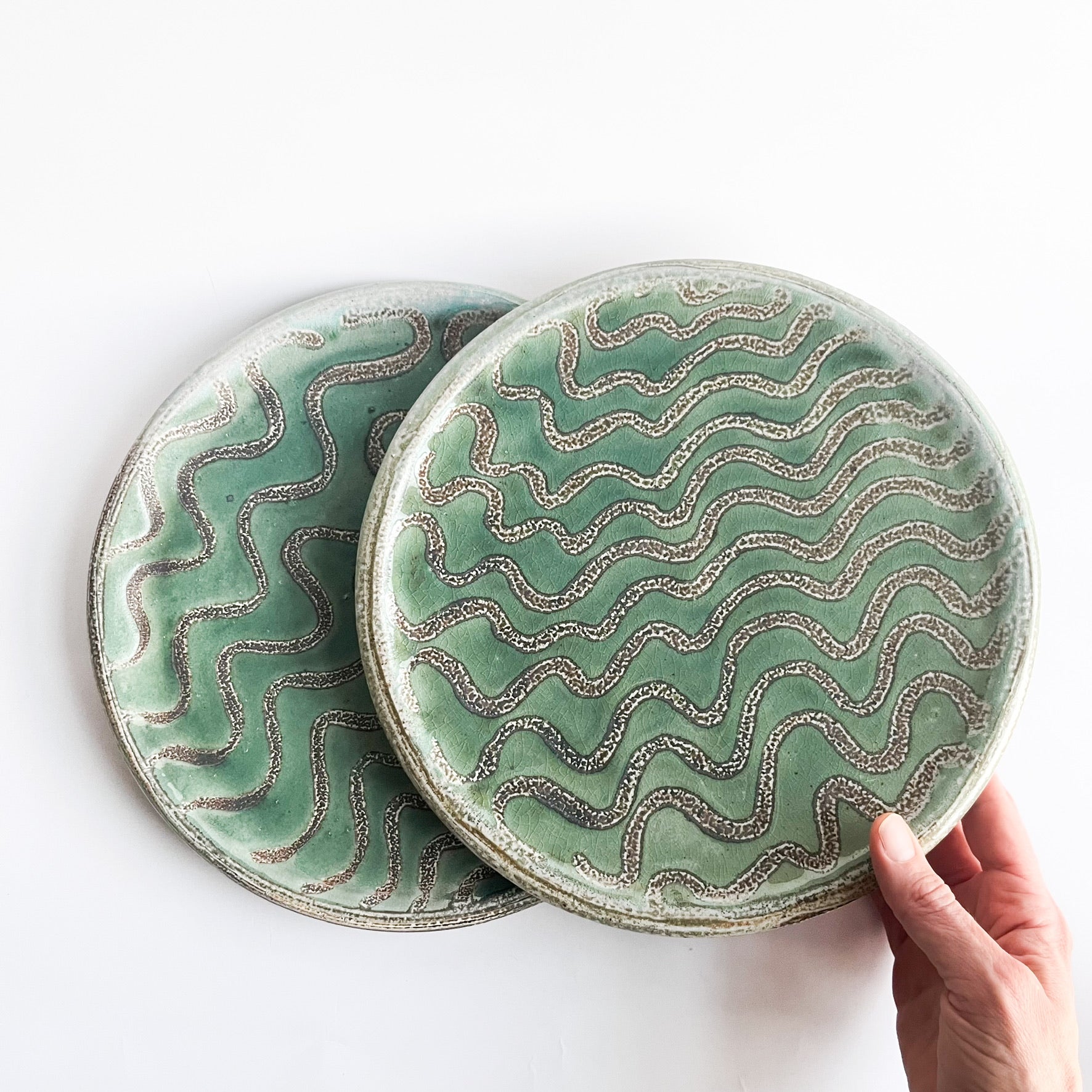 Wheel thrown stoneware clay, soda fired, green glazed patterned surface