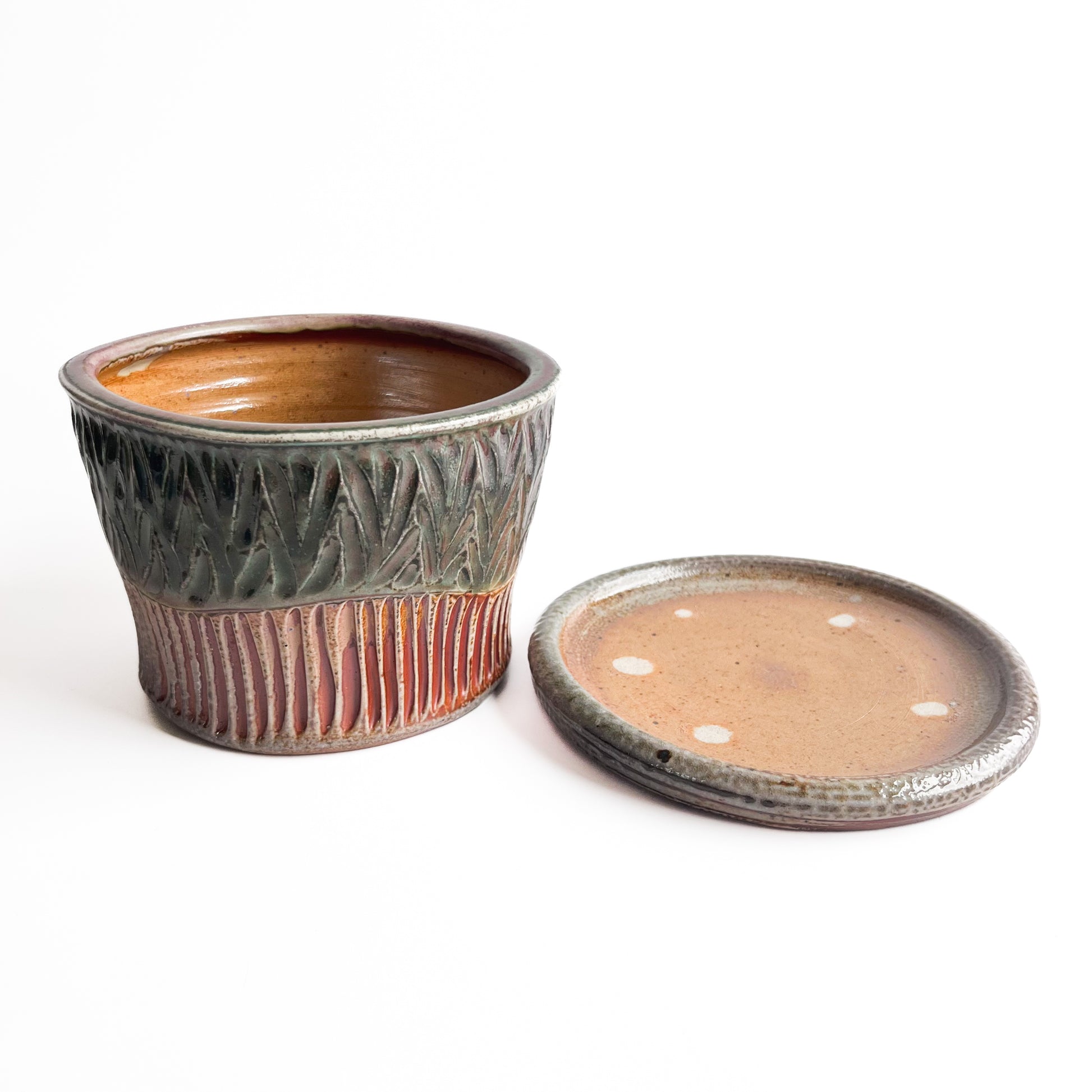 Wheel thrown stoneware clay, soda fired and hand carved green glaze pattern. Saucer included. Dimensions: 4.5 x 6 x 6 Inches