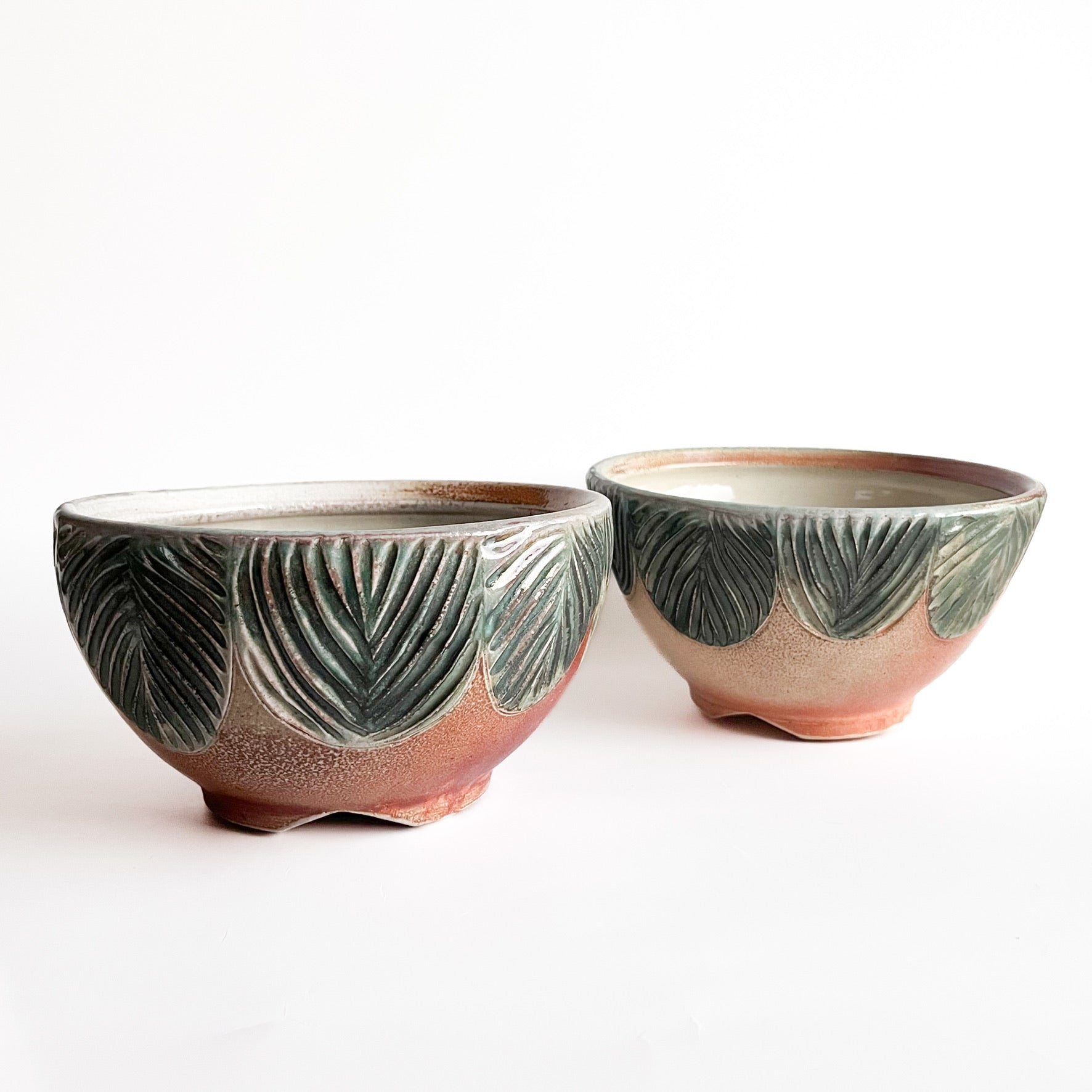 Wheel thrown soda fired stoneware, hand carved green leaf patterns, variations occur from piece to piece due to the nature of the soda firing
